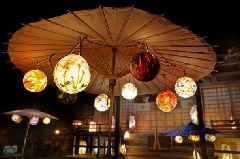 鳥取県の伝統工芸品である因州和紙で制作された和紙玉を和傘に飾り、三朝神社をメイ…