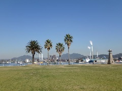 ヤシの木が並び、南国情緒あふれる臨海公園。徳山港を挟んで対岸には、工場やクレー…