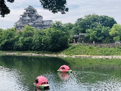 岡山県の新しい観光スポット、岡山城と後楽園の間を流れる旭川に浮かぶ桃ボート。“…