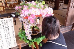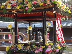 最上稲荷の根本大堂に設けられた誕生仏の御堂が草花で飾られ、甘茶が供えられて、灌…