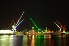 尾道水道をはさんで向島にそびえるクレーンが、週末および、祝日とその前日の夜に、…