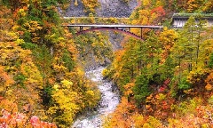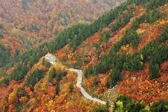 白山白川郷ホワイトロード沿道のブナ、ミズナラ、ナナカマド、ヤマツツジ、カエデなどが色づき、石川県と岐阜県を結ぶ全長33.3kmの舗装路に彩りを添えます。栂の木台の駐車場や、蛇谷大橋周辺の山々の紅葉をはじめ、姥ヶ滝(うばがたき)やふくべの大滝など、大小さまざまな滝を有する渓谷とのコントラストもこの時季ならではの景観です。白山の主峰三山と地獄谷が最もよく見える白山展望台からは、錦秋の風景を堪能できます。