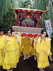 嵐山周辺で往時を偲ぶ斎宮行列が行われます。斎王が任命を受け、都から伊勢の斎宮へと向かう旅を「斎王群行」といい、その行列は、斎王以下、監送使、官人、女官などあわせて数百人にもおよびました。華やかな装束を纏った参加者約100人により行列が再現され、あわせて雅楽の奉納も行われます。