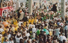 生石神社の秋祭りでは、祭神である大穴牟遅尊を乗せた神輿を若者が、少毘古那尊を乗せた神輿を壮年者が担ぎ、ぶつけ合って激しく練り合わせます。往昔、神功皇后が三韓征伐に向けて播磨灘を航行中に、軍艦に牡蠣が付着して速度が上がらなくなり、その牡蠣を取り除くために艦船同士を擦り当てたことに準えたとされ、「神輿の練り合わせ」(ケンカ神輿)が見どころです。「お面掛」と呼ばれる神事では、能、舞、謡を合体したものを一人で奉納します。神の強さを象徴する「赤囃子」と呼ばれる神賑(かみにぎわい)では、神の警護役の猿田彦に扮した人物が、周りで囃したてる若者たちを棒で追い払います。2台の化粧屋台の練り合わせは見ものです。