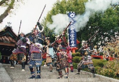 織田信長の偉業を称え、毎年10月19日に「船岡大祭」が斎行されます。神事に際しては、桶狭間の合戦にちなみ、仕舞「敦盛」や舞楽が奉納されます。その年により、長篠の合戦にちなんだ火縄銃の奉射または信長公の宝物の展示なども行われます。