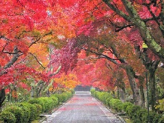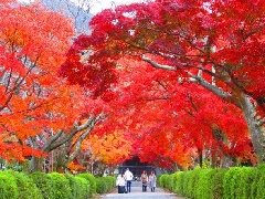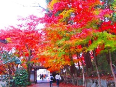 比叡山麓にある西教寺は、紅葉の名所として知られています。特に総門より長く続く参道は、真っ赤に染まったもみじのトンネルとなり圧巻です。「もみじ参道通り抜け」を楽しみながら参拝できます。西教寺唐門から見えるびわ湖が絶景。本堂東側にある黄金に輝く大銀杏も必見。西教寺は、聖徳太子による創建と伝わり、比叡山焼き討ちで焼失した後、明智光秀公により復興されました。明智光秀の墓があり、伏見城の遺構である客殿(重要文化財)や紀州徳川家の寄進で再建された本堂(重要文化財)など見どころがたくさんあります。