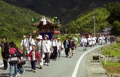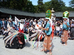 国土安泰、海上安全、民族の繁栄、五穀豊穣の感謝、産物の増産などを祈念する神人一和の伝統神事です。大三島をあげての供奉が行われ、獅子頭や獅子舞神役、供奉者が、平安朝から吉野朝に至る華麗な色彩の装いで勢ぞろいし、延々4km余りの神幸路を歩きます。