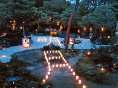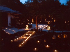 沙羅双樹の花が咲く美しい庭のある東林院で、夜間拝観が行われます。住職手づくりのあかり瓦「梵燈」や、古瓦の上に置かれたろうそく約800本に火が灯され、沙羅双樹の庭、枯山水の庭が幻想的に浮かび上がります。別席で抹茶(有料)も味わえます。