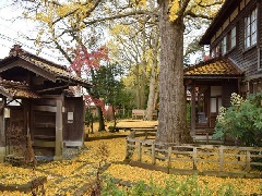 山の文学者として知られる深田久弥(ふかたきゅうや)ゆかりの品などを展示する山の文化館で、例年10月下旬から11月上旬にかけて、イチョウが黄葉の見頃を迎えます。樹齢約650年といわれるイチョウなどの巨木が敷地内にあり、秋になると黄葉の絨毯が辺り一帯に広がります。深田久弥は「日本百名山」の著者であり、館内では久弥に関する資料のほか、山に関する書籍なども収蔵されており、山の魅力についても紹介されています。
