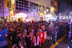 中洲の街が一丸となり、年に一度の感謝の夕べ「中洲まつり」が開催されます。まつりの華である「中洲國廣女みこし」と「花魁道中」が行われるほか、さまざまなステージイベントが各所で行われ、まつりを盛り上げます。中洲中央通りにも、飲食店や物販ブースが立ち並び、大勢の人で賑わいます。