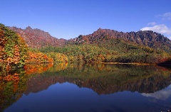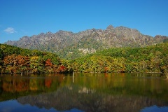 戸隠連峰を映し出す鏡のように静かな鏡池が、例年10月中旬に紅葉のピークを迎えます。池周辺ではウルシやミズナラ、ナナカマド、カエデなど、さまざまな樹木が赤や黄色に染まります。四季それぞれに美しい姿を見せる鏡池が一年中で最も華やぐ季節です。