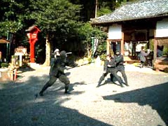 服部一族が祖神とする少彦名命(すくなひこなのみこと)、金山ひめ命(かなやまひめのみこと)の御霊を、神輿に移して奉る私的なお祭りです。黒党(くろんど)とは、黒装束で正装し奉仕した人たちのことを言い、現在では、黒装束を身につけた忍者集団による、伊賀流忍術の演武奉納などが行われます。※金山ひめ命の「ひめ」は比に口偏に羊