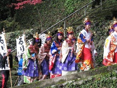 るり姫伝説が残る白滝付近で、るり姫の霊を供養するため、きらびやかな姫の衣装を纏った女児と花みこしを担いだ男児により、稚児行列が行われます。花みこしを滝つぼへ投下する伝統の行事も営まれ、この祭りの見どころとなっています。「もみじまつり」も開催され、白滝公園では17時から20時まで紅葉がライトアップされます。
