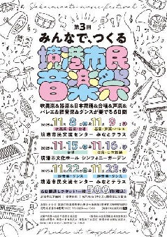 「みんなで、つくる」をテーマに、第3回となる「境港市民音楽祭」が開催されます。市民と演奏者が一堂に会し、演奏と鑑賞が同時に楽しめる、すべての人に開かれた超参加型の音楽イベントです。11月8日と9日、22日と23日は境港市民交流センター(みなとテラス)、15日と16日は境港市文化ホール(シンフォニーガーデン)で行われます。吹奏楽、器楽、日本舞踊、合唱、声楽、バレエ、軽音楽、ダンスが奏でる6日間です。