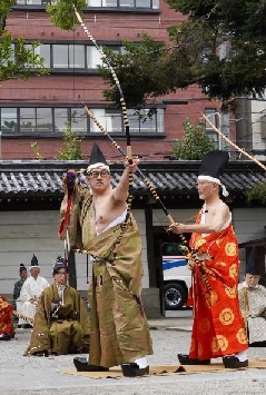 白峯神宮では、武道と弓道上達を願い、毎年11月15日に御弓神事が執り行われます。弓馬術礼法小笠原教場により奉納されます。境内の伴緒社には、弓の名手であった源氏の頭領・源為義公、鎮西八郎為朝親子が御祭神として祀られています。