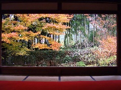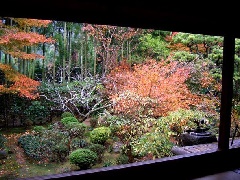 京都大原の宝泉院では、例年11月上旬から順に紅葉が見頃を迎えます。客殿の西方、柱と柱の空間を額に見たてて観賞する「額縁の庭園」で知られ、秋には、竹林の緑と紅葉したカエデの赤が織り成す、絵画のような美しい景色を見ることができます。宝泉院は、約800年の歴史を持つ古刹で、樹齢700年の五葉の松や、樹齢300年の沙羅双樹がたたずむ鶴亀庭園などの見どころもあります。