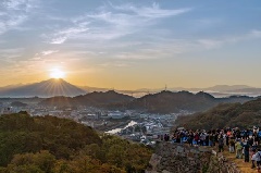 「絶景の城米子城」として知られるようになったきっかけの一つ「ダイヤモンド大山」の観望会が、今年も開催されます。山頂から昇る朝日がダイヤモンドの輝きに似ていることから、「ダイヤモンド大山」と称され、毎年10月22日頃と2月20日頃、気象条件の良いときに見ることができます。まるで後光が差したかのような、大山から一直線に届く陽光に包まれた米子城跡は、筆舌に尽くしがたいほどの美しさです。※登城にかかる時間は約15分です。気象条件によっては見られない場合もあります。