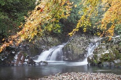 湯ヶ島温泉から天城峠方面へ約6kmの山間にある滑沢渓谷は、四季折々に美しい風情が楽しめ、特に紅葉シーズンは見応えがあります。井上靖の処女小説「猟銃」の舞台となったところで、渓谷沿いにある遊歩道の途中には文学碑が立っています。