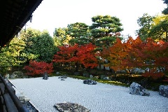 室町幕府3代将軍の足利義満により、夢窓疎石(むそうそせき)を開山として創建された相国寺は、紅葉の名所としても知られます。広々とした境内のあちこちでモミジやイチョウが色づき、特に鐘楼「洪音楼(こうおんろう)」の側の紅葉は、鮮やかな彩りを見せます。9月25日から12月14日は「秋の特別拝観」も行われます。