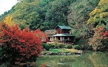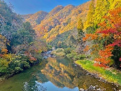 旭川の支流、宇甘川にある宇甘渓は、例年11月になると紅葉で彩られます。急流に浸食された谷間が約5kmにおよぶ渓流では、絶壁の岩肌の各所に、ケヤキやイロハカエデが色づく様子を見ることができます。周辺は、吉備清流県立自然公園に指定されており、シンボルとなる赤橋や水辺の散策道、20基の句碑が点在する川柳の小道などが整備されています。