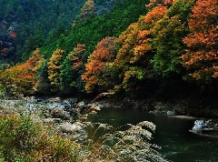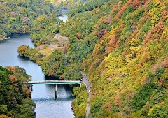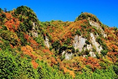 青蓮寺からさらに青蓮寺川をさかのぼり、トンネルを抜けた先にある香落渓では、例年11月になると紅葉する風景を楽しむことができます。川沿いに、斧で断ち割ったような柱状節理の岩壁が約8km続き、秋には全山が燃え立つような紅葉に彩られます。特に車窓から眺める風景は格別です。