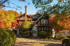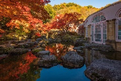 印象派の巨匠クロード・モネの「睡蓮」や、民藝運動ゆかりの作品群などを所蔵するアサヒグループ大山崎山荘美術館では、美術品鑑賞とともに、例年11月下旬になると紅葉狩りが楽しめます。モミジやイチョウ、ドウダンツツジなどが秋色に染まり、広大な庭園と築約100年の英国風山荘が、紅葉で華やかに彩られます。2階の喫茶室テラスからは、美しく雄大な秋の風景を眺めることができます。