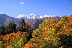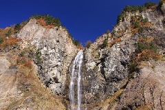 落差86mのふくべの大滝は、白山白川郷ホワイトロード随一の名所として知られ、紅葉の時季には特にダイナミックな景観が望めます。地響きと轟音を上げて断崖を流れ落ちる水が、舞い上がる水煙となり、そのしぶきが道路を覆うこともあるほどで、周辺のヤマウルシ、ヤマツツジ、カエデ、オオカメノキなどを潤し、岩肌に映える紅葉が堪能できます。ピークは例年10月下旬です。