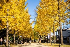 敷地面積約6haの学びの森にある約250mのイチョウ並木は、「学びの森プロムナード」の愛称で親しまれ、黄葉シーズンになるとフォトスポットとしても人気です。例年11月中旬になると黄葉の最盛期を迎え、11月下旬には落葉が辺り一面を覆い、黄色いじゅうたんを見ることができます。敷地内の喫茶店「KAKAMIGAHARA STAND」では、ガラス張りの店内からパンやコーヒーを味わいながら、黄葉を楽しむことができます。11月下旬に色づく樹齢50年以上の大イチョウのある広い芝生広場や、京都嵐山の竹林をイメージして整備されたすず風の小径など、憩いのスポットが複数点在しています。