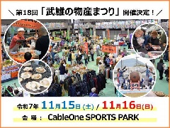 武雄市内各地の特産品が一堂に集まる「武雄の物産まつり」が、CableOne SPORTS PARK(武雄市民体育館)で開催されます。地元農産物や特産品の販売をはじめ、友好都市の特産品や、佐賀牛・若楠ポークの特売などが行われます。