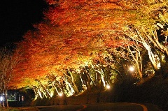 深耶馬渓で、紅葉の時期にあわせてライトアップが行われます。県道28号沿いの公共駐車場付近、約50mにわたる「ひさしもみじ」の並木が、照明により美しく浮かび上がります。