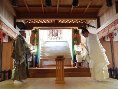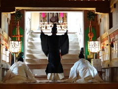 出雲大社の「古伝新嘗祭」で使用する神聖な神火を起こすための燧臼(ひきりうす)と燧杵(ひきりぎね)を、出雲大社の宮司に授け渡す儀が行われます。「亀太夫神事」と呼ばれ、出雲大社が納める餅のできばえについて、苦情を口やかましく言い立てる変わった神事です。その後、出雲大社の宮司によって「百番の舞」が舞われます。