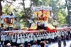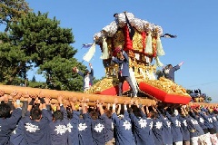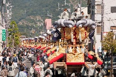 琴弾山の山頂にある琴弾八幡宮の大祭は、毎年10月中旬に行われます。9台のちょうさ(太鼓台)が、市内を華やかに練り歩きます。3tもの勇壮華麗なちょうさが競り合う様子は、圧巻の迫力があります。琴弾八幡宮の成り立ちにまつわる神話に基づいて、美しく着飾った子どもたちによる稚児行列も、見どころのひとつです。夜になると、ちょうさには電飾が施され、夜の闇に煌びやかに浮かび上がります。太鼓の音が響き渡り、大勢の観客により街は活気に溢れます。