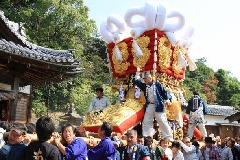 1682年宮造立と伝わる観音寺の古社、大野原八幡宮の秋の例大祭が執り行われます。赤や白の「とんぼ」を載せた「ちょうさ」と呼ばれる太鼓台と、2台のだんじりが街を練り歩き、お祭りムードを盛り上げます。宮入りで、勇壮華麗なちょうさが練り合う様子は、迫力があり、観客から歓声が上がります。夜になるとちょうさはライトアップされ、夜の闇に煌びやかに浮かび上がります。