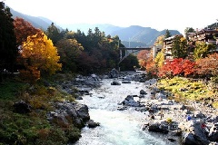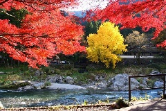 多摩川上流に位置する御岳渓谷では、例年10月下旬から11月下旬にかけて美しい紅葉が楽しめます。イチョウ、イロハモミジ、イタヤカエデ、トウカエデ、ムクロジ、コナラなどの落葉樹が赤や黄色に色づく、風光明媚な景観は見応えがあります。玉堂美術館前のイチョウはひと際大きく、周辺の紅葉や常緑樹、多摩川の清流とのコントラストは必見です。御岳渓谷は、秩父多摩甲斐国立公園でも特に美しい渓谷美で知られており、四季を通じて、訪れる人の目を楽しませます。