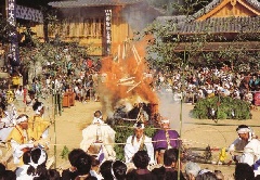 昔より「ゆが・こんぴら両参り」といわれ、両宮のご神火が年に一度合わさるお祭りです。点火した大護摩壇に護摩木(願い木)を投げ入れ、くすぶり続ける火の中を裸足で渡る「火渡り荒行」が盛大に行われ、無病息災を祈ります。