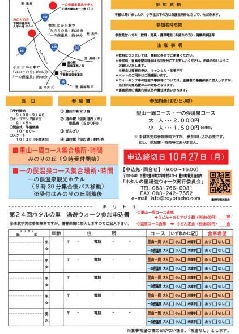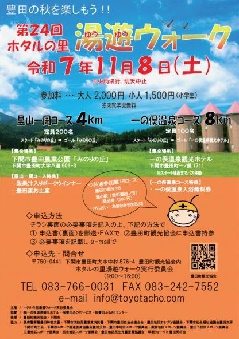 秋深まる豊田町内を各自のペースでウォーキングできる「ホタルの里湯遊ウォーク」が行われます。里山一周コース(4km)、一の俣温泉コース(8km)の設定があります。町の特産品の参加賞をはじめ、ぜんざいや餅まきなどのおもてなしで、山里、豊田町の魅力を満喫できます。