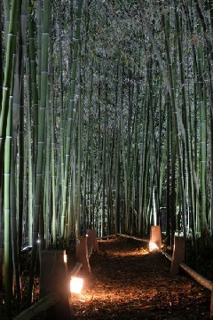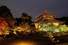 足利義満が創建した洛西屈指の古刹、鹿王院で夜間特別拝観が行われます。足元灯により光の路が演出され、仏牙舎利(ぶつげしゃり)を安置する舎利殿や庭園が、柔らかい光で照らし出されます。嵐山を借景とする枯山水庭園、山門から中門に続く石畳の参道は、紅葉の名所として知られ、幻想的な雰囲気の中、秋の夜のもみじ観賞を楽しめます。