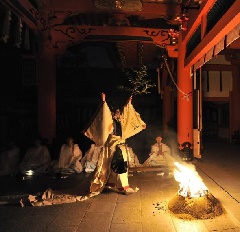 伏見稲荷大社では火焚祭の後、夕刻の18時から「御神楽」が大前にて奉奏されます。一時中断していたものが文久3年に禁裏御所(きんりごしょ)の特別の思召しで再興され、現在では毎年11月8日に伏見稲荷大社の神職によって奉仕されています。庭燎(にわび)の薄明かりの中で、本歌、末歌、和琴、笛、篳篥(ひちりき)が次々と奏でられ、早韓神(はやからかみ)が奏される中、荘重古雅な「人長舞(にんじょうまい)」が舞われます。