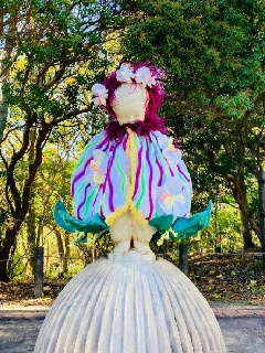 六甲高山植物園のアイドル、小便小僧くんが風邪をひいてしまわないように、本格的な冬が来る前に、暖かいマントを着せてあげる毎年の恒例行事です。2025年は「ミヤマオダマキ」をモチーフに、神戸芸術工科大学の学生がデザイン・製作したマントが着せられます。