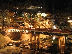 冬景色の美しい飛騨高山で、ライトアップが行われます。市内の中心部を流れる宮川に架かる赤い中橋が銀世界の中に浮かびあがり、昼間とはまた違った幻想的な光景が楽しめます。高山のシンボルのひとつである中橋は、高山が城下町として栄えた頃に架けられたもので、たびたびの水害により流されましたが、昭和40年(1965年)に現在の橋に架け直されました。