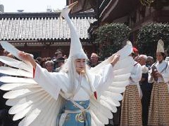 浅草寺では、春と秋の年2回「白鷺の舞」が行われます。浅草寺慶安縁起絵巻の祭礼行列の中に描かれていた「鷺舞」を、昭和43年(1968年)に、東京100年の記念行事として創始したものです。武人、楽人など総勢約40人が居並ぶ境内を、白鷺の衣装を着た踊り子8人が、優雅な笛、太鼓の調べにあわせて白い羽を広げ、舞い踊りながら一巡します。