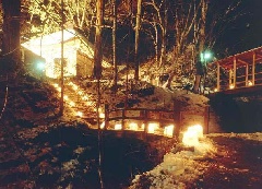 鹿教湯温泉の夜を美しく彩る「氷灯ろう夢祈願」が、文殊堂・薬師堂周辺で行われます。温泉街から湯端通りをぬけ、五台橋の屋根の下をくぐり、文殊堂への46段の階段から薬師堂周辺まで続く通りを、約200個の氷で作られた「氷灯ろう」にろうそくを灯して飾ります。もう一つの屋根付の橋「寺沢橋」から湯坂を望むと、立ち上る湯気が見え、幻想的な雰囲気がさらに盛り上がります。