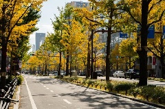 大阪の中央を南北に繋ぐ御堂筋沿いのいちょう並木が、例年11月下旬になると黄葉し始めます。約4.2kmにわたって植えられた約900本が一斉に色づき、御堂筋を黄金色に染め上げます。