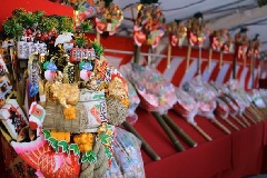 三河で唯一の「酉の市」が、毎年12月最初の金土曜に西光寺で開催されます。家内安全、商売繁盛、開運招福を願う人々で賑わう、冬の風物詩です。境内には熊手や宝船の出店があり、おぜんざいなど屋台も並びます。