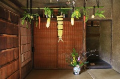 四国各地の伝統的なお正月飾りが、四国村ミウゼアムの各民家に飾りつけられます。神棚に魚や野菜を吊るす、香川県に伝わる珍しい飾りなどが見学できます。四国村ミウゼアムは、四国を中心に、各地から移築復原した江戸時代から明治時代にかけての民家や建造物が建ち並ぶ、古民家の屋外博物館です。