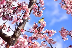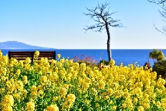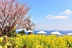 寒緋桜(カンヒザクラ)と山桜との交配種の“寒桜”約100本が、例年1月上旬から2月上旬にかけて、城ヶ崎海岸を淡紅色に彩ります。時期を同じくして、菜の花の早咲き種が開花し、12月下旬から2月上旬まで楽しむことができます。耐寒性が強く、寒い中で咲く品種で、1000平方mにわたって咲く約2万株が、伊豆にいち早く春の訪れを告げます。