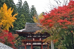 室生寺では、例年11月中旬になると、太鼓橋から本堂(潅頂堂)にかけて、モミジやイチョウなどが赤や黄色に色づき、秋ならではの美しい景色が広がります。歴史的建造物と、境内の紅葉との取り合わせも見事です。塔の左の道を登ると、御影堂(重要文化財)のある奥の院へと続きます。