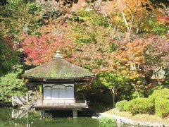 紅葉渓庭園(もみじだにていえん)はその名の通り、紅葉の名所として知られ、例年11月下旬になると、イロハモミジなどの色鮮やかな赤色で染まります。堀のなかに浮かぶ釣殿「鳶魚閣(えんぎょかく)」が情緒を醸し出すほか、木造銅板葺きの屋根が美しい「紅松庵(こうしょうあん)」ではお茶をいただくこともできます。