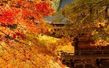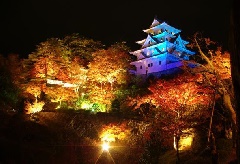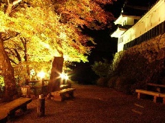 郡上八幡城の白亜の天守閣に紅葉が映える中、城下一帯で「もみじまつり」と題し、期間中の週末を中心に催しが行われます。風格あるお城と紅葉を背景に、郡上八幡城会場では、火縄銃の演武、和太鼓の演奏などがあるほか、城下町プラザでは、新鮮朝市や郡上八幡限定の土産の販売などが催されます。11月21日から30日まで、「天空のもみじ庭園ライトアップ」と夜間特別開城が同時開催されます。約50基以上の照明により幻想的に照らし出され、燃えているかのように真っ赤なもみじが天守閣を包み込む様は、「天守炎上」とも表現されるほどの見応えです。