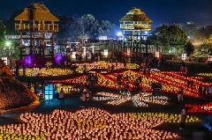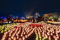 広大な吉野ヶ里歴史公園が、光と炎に彩られるライトアップイベント「吉野ヶ里 光の響」が開催されます。城柵と環濠に囲まれた南内郭では、キャンドル灯籠を使った「光の地上絵」が描かれ、弥生時代の復元建物のライトアップやイルミネーションが、神秘的な雰囲気を演出します。バーナーの炎が幻想的な熱気球の夜間係留(ナイトグロー)も見どころです。レストランでは、数量限定の特別メニューが用意されるほか、ケータリングカーによるグルメコーナーも登場します。※夜間イベント時、西口・北口は閉門。東口が開門